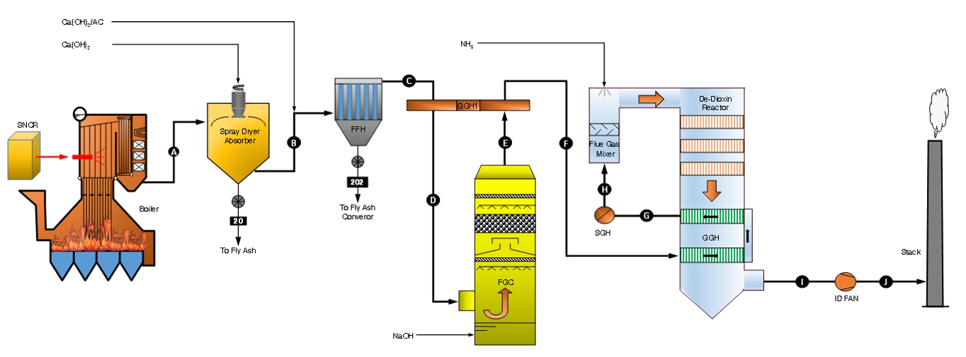 采用SNCR+半干法+干法+布袋除塵器+濕式洗滌+SCR的組合工藝,實現固體廢棄物焚燒尾氣的超凈排放和煙氣消白。