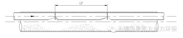 輸送管道采用管中管,其結構如圖二所示,由大小2根管道組成,小管套在大管的內部并固定在大管頂部,在小管下方每隔一定距離開有旁路缺口,缺口內鑲嵌阻尼孔板。正常輸送時管道內部呈層流輸送的狀態,上層極少顆粒懸浮在空氣中,呈稀相輸送,大量顆粒沉積在管道的下部,呈密相輸送。由于低速輸送引起大管中灰的堆積,造成大管截面減小,阻力增大,迫使大量空氣進入小管,并從下游開口噴出,形成強烈的湍動氣流,從而撓動飛灰,并將其切割吹散,這種方式不斷的反復循環,推動飛灰向前移動,從而達到低速輸送而不堵管的目的。如果管道的某處發生堵管,則在該段灰柱上游的空氣被迫流經小管而向下游運動,當在某一開口處出現了空氣壓力大于移動灰柱所需要的壓力狀態,于是空氣就從該開口處噴出將灰柱分割,形成長度較短的灰柱加以輸送并逐漸將其吹散而恢復正常輸送狀態。