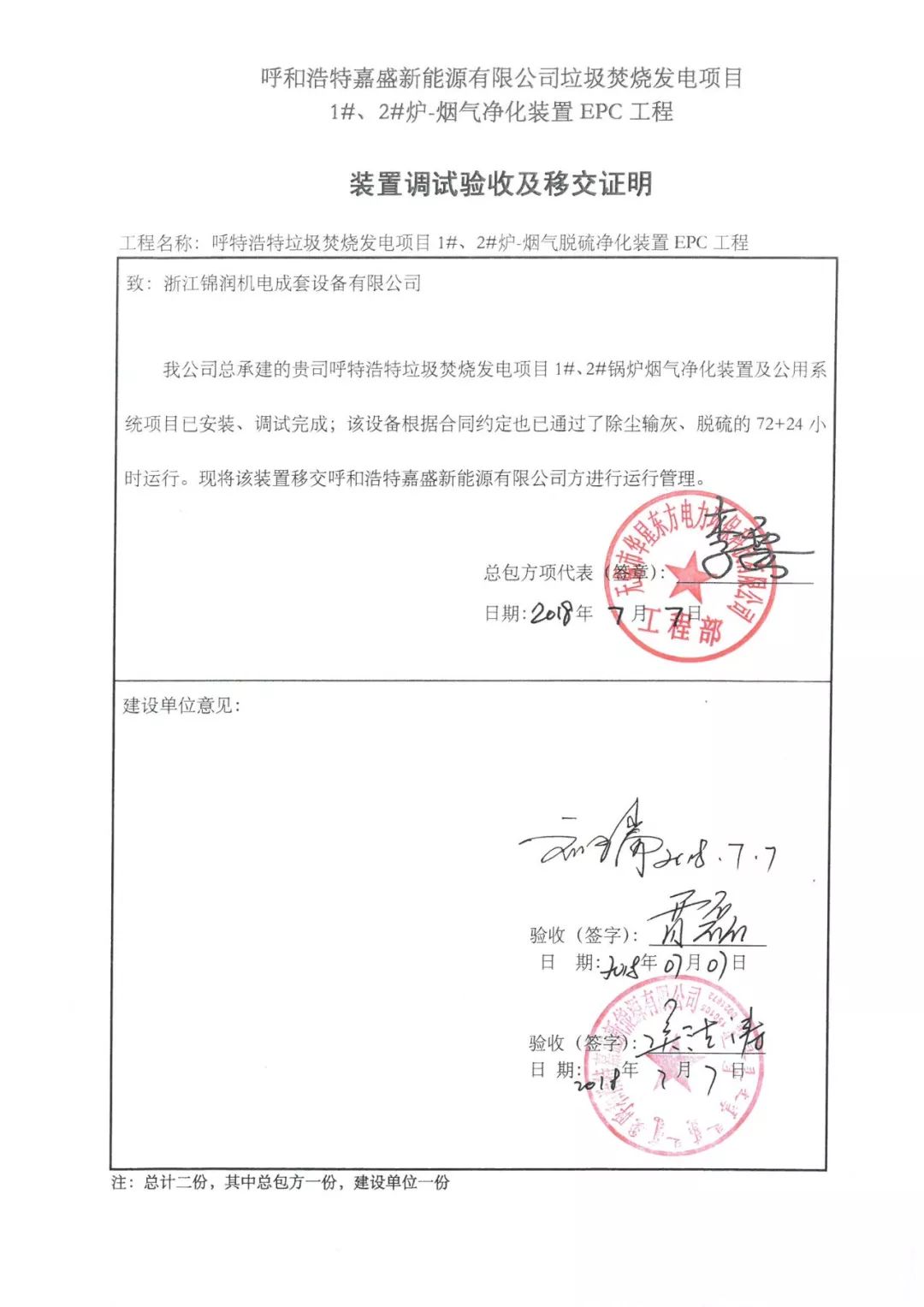 我司承建的呼和浩特嘉盛新能源有限公司2×650t/d循環(huán)流化床垃圾焚燒煙氣凈化系統(tǒng)及熱電聯(lián)供項目已于2018年7月7日完成竣工驗收,該項目采用爐內(nèi)噴鈣+SNCR脫硝+循環(huán)流化床脫硫反應(yīng)塔+消石灰系統(tǒng)+活性炭吸附+布袋除塵器除塵+飛灰穩(wěn)定化等煙氣凈化工藝,現(xiàn)系統(tǒng)運(yùn)行穩(wěn)定,為我公司EPC項目。