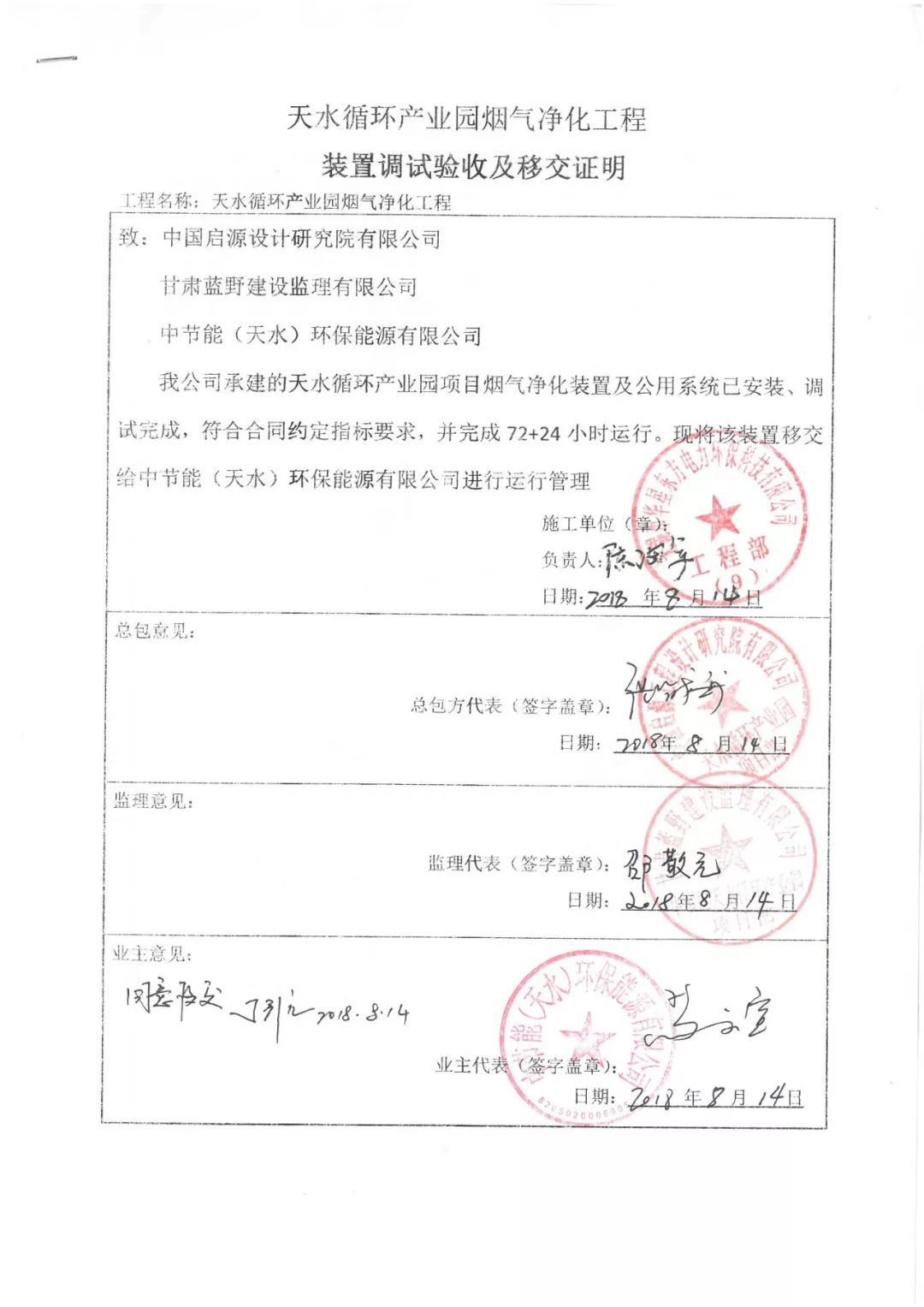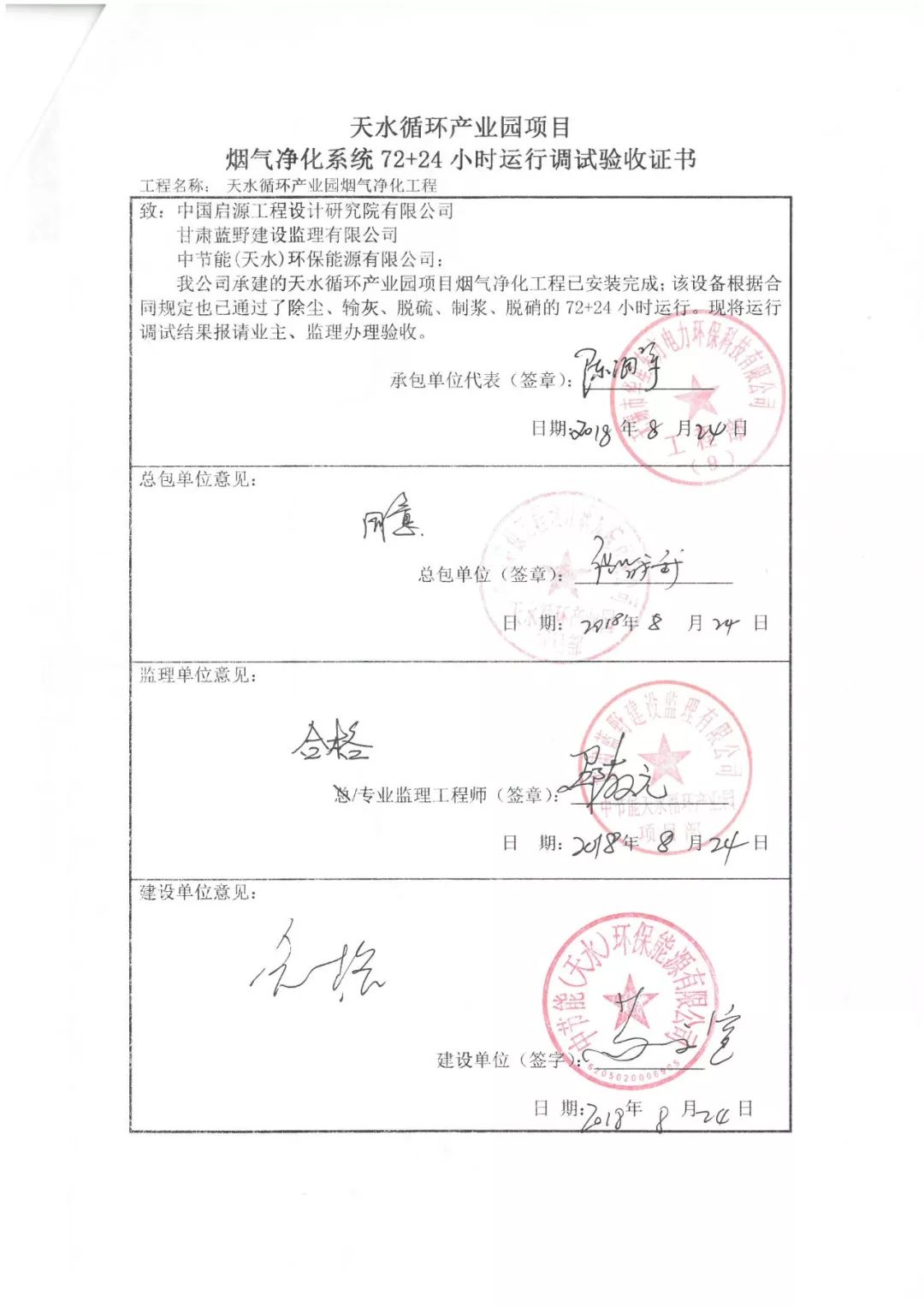 天水循環產業園1x600t/d生活垃圾焚燒煙氣凈化工程項目竣工驗收