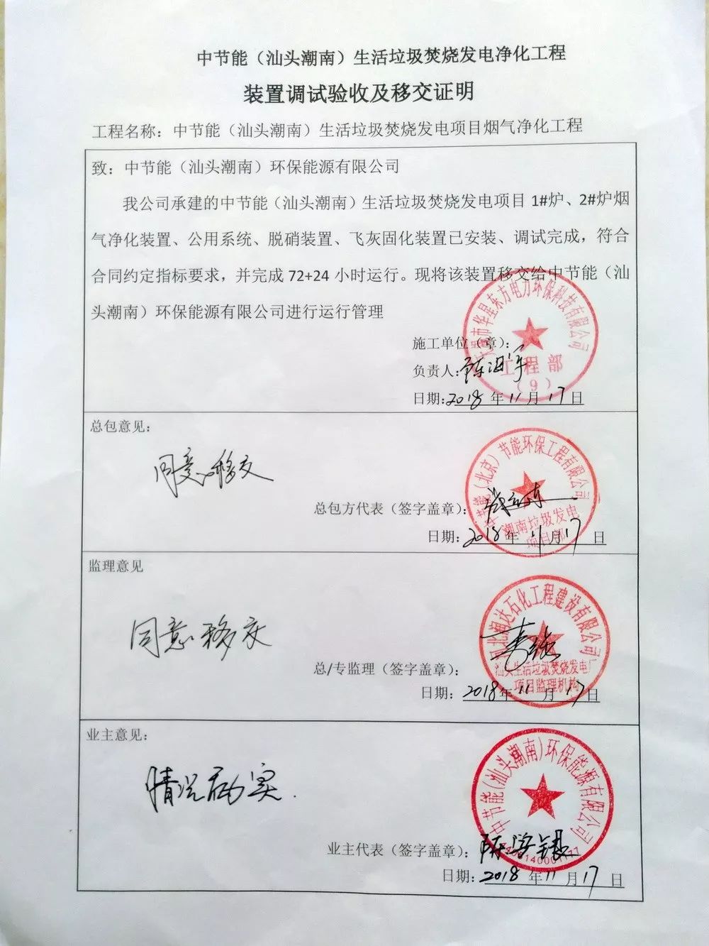 我公司承建的汕頭潮南2x500t/d生活垃圾焚燒煙氣凈化工程于2018年11月17日完成各項調試工作并通過驗收。