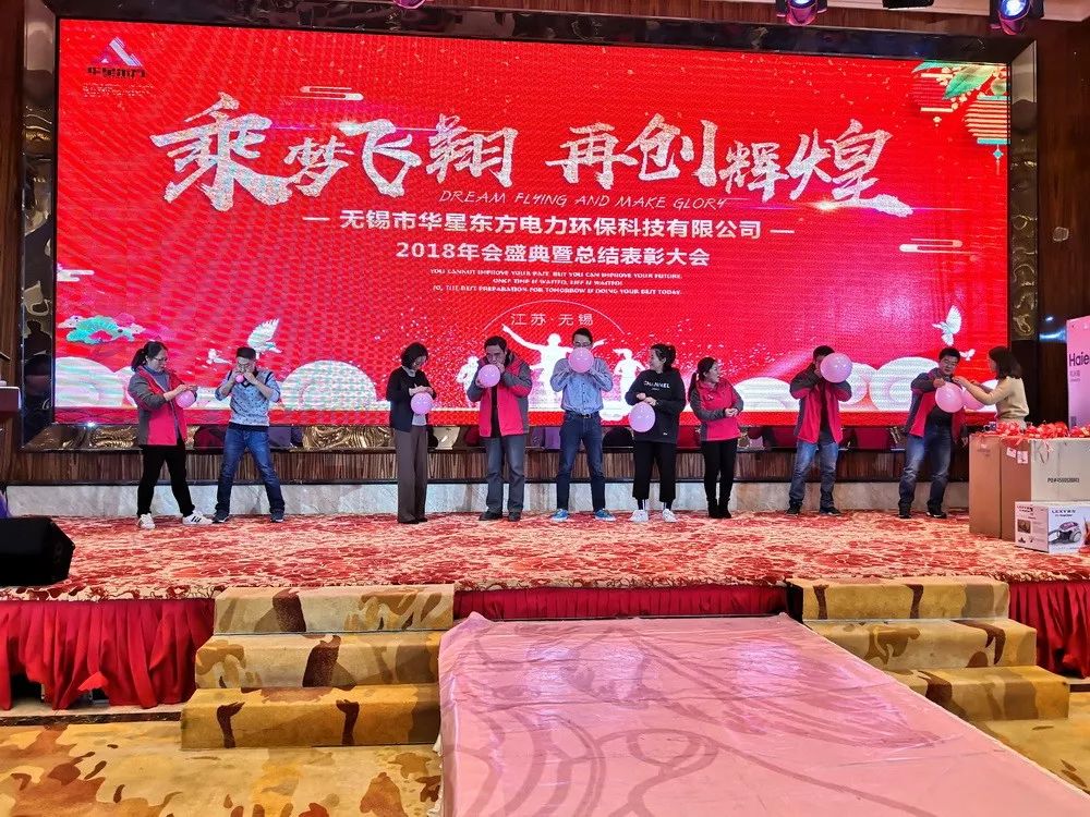 華星東方總部、無錫、泰州、膠州等各地分支機構及生產制造中心工作人員和代表歡聚一堂,共聊今昔,但仍有部分職工堅守在全國各地的工程崗位上。年會盛典在一場紅火的水鼓舞中拉開序幕。富有韻律的鼓聲陣陣,猶如激昂奮發的青春,華星人邁著整齊劃一的堅定步伐,走過了勵精圖治的2018年。 The working staff and representatives of HXET Headquarters, other branches and manufacturing centers in the cities of Wuxi, Taizhou and Jiaozhou,etc gathered together to chat about the past and the present. However, there were still some employees who continued to work at their engineering posts all over the country. The annual meeting celebration was kicked off with a lively performance of water drum dance featuring rhythmic drum sounds which represented the passionate youth owned by the whole staff of HXET who paid every effort to successfully make the company prosperous in the year 2018 by sticking to a uniform and firm target.