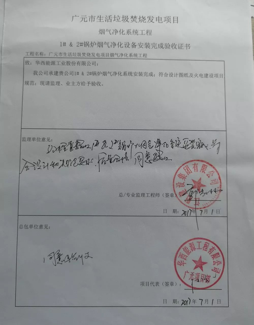 四川廣元2x350t/d垃圾焚燒發電項目煙氣凈化工程通過竣工驗收公示