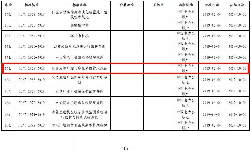 其中,由我司和恩菲院共同主編完成的《垃圾發電廠煙氣凈化系統技術規范》這一行業標準(標準編號:DL/T1967-2019),也經國家能源局批準予以發布,將于2019年10月01日正式實施。