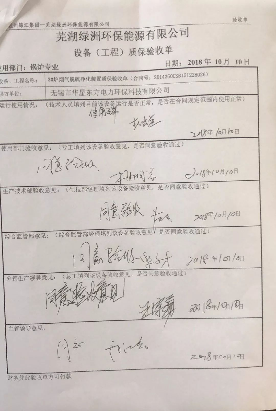 我司承建的蕪湖1x650t/d生活垃圾焚燒廠3號爐煙氣脫硫凈化裝置于2018年10月10日通過質保驗收。