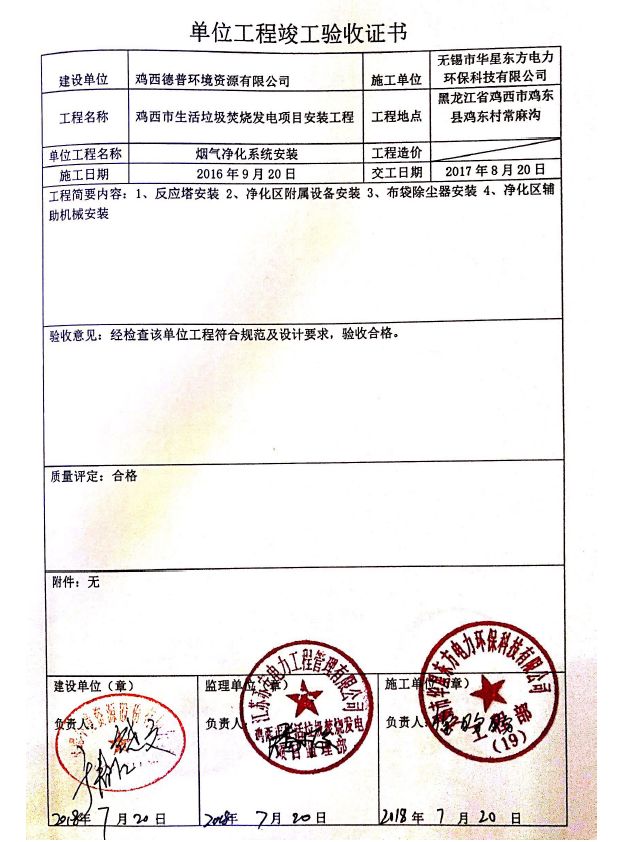 華星東方承建的雞西市生活垃圾焚燒發(fā)電項(xiàng)目煙氣凈化工程通過環(huán)保驗(yàn)收