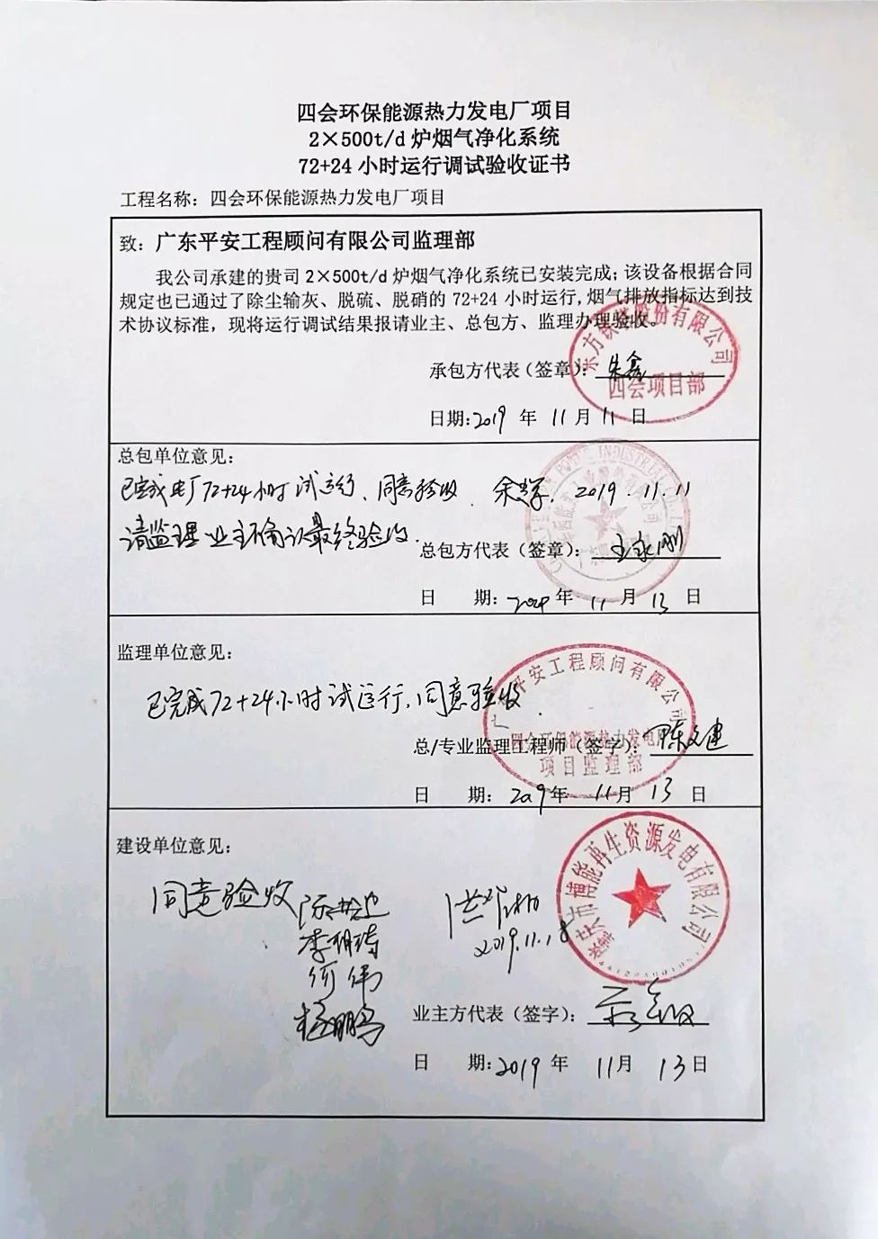 我公司承建的四會環保能源熱力發電廠項目煙氣凈化工程于2019年11月11日通過72+24小時運行驗收。