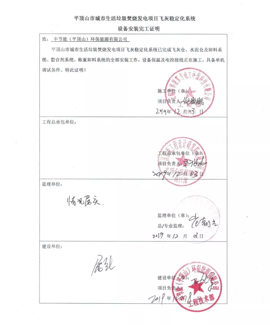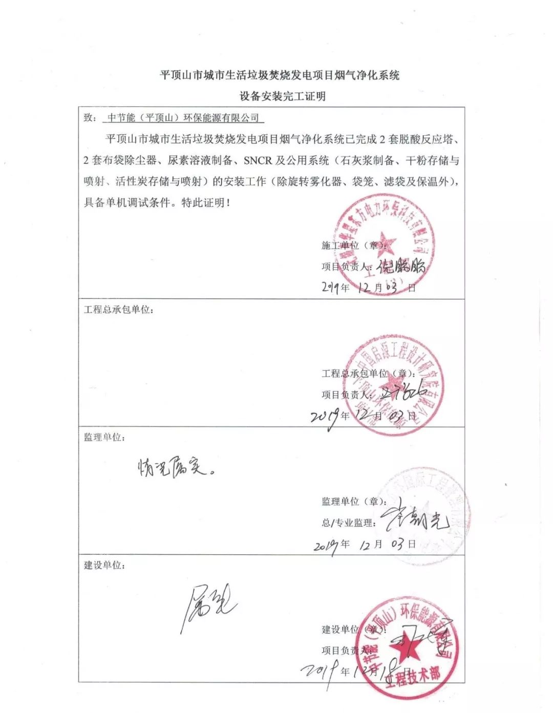 我司承建的河南平頂山2x500t/d生活垃圾焚燒發電項目煙氣凈化工程于2019年12月03日設備安裝完工,具備單機調試條件。