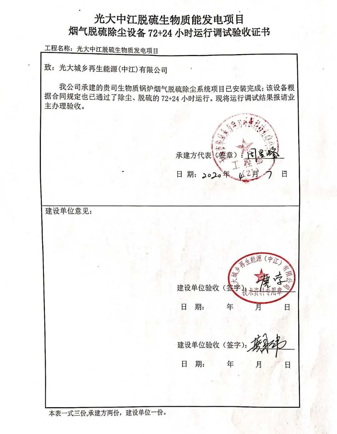 華星東方承建的光大中江生物質(zhì)發(fā)電項(xiàng)目煙氣凈化工程于2020年4月7日通過72+24小時(shí)驗(yàn)收。