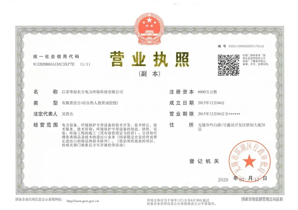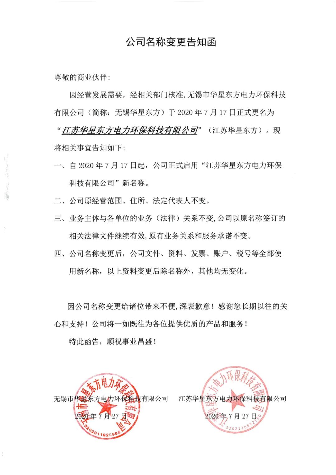 2020年7月17日,無錫市華星東方電力環(huán)保科技有限公司正式更名為:“江蘇華星東方電力環(huán)保科技有限公司”,以下為變更公告: