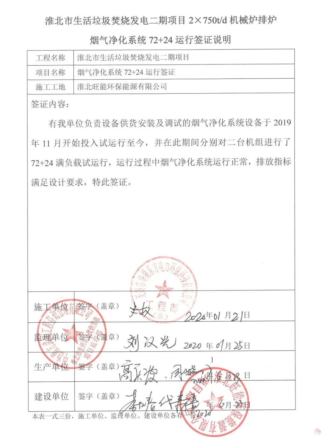 我公司承建的安徽省淮北市生活垃圾焚燒發電二期項目煙氣凈化工程于2020年6月23日通過72+24小時試運行。