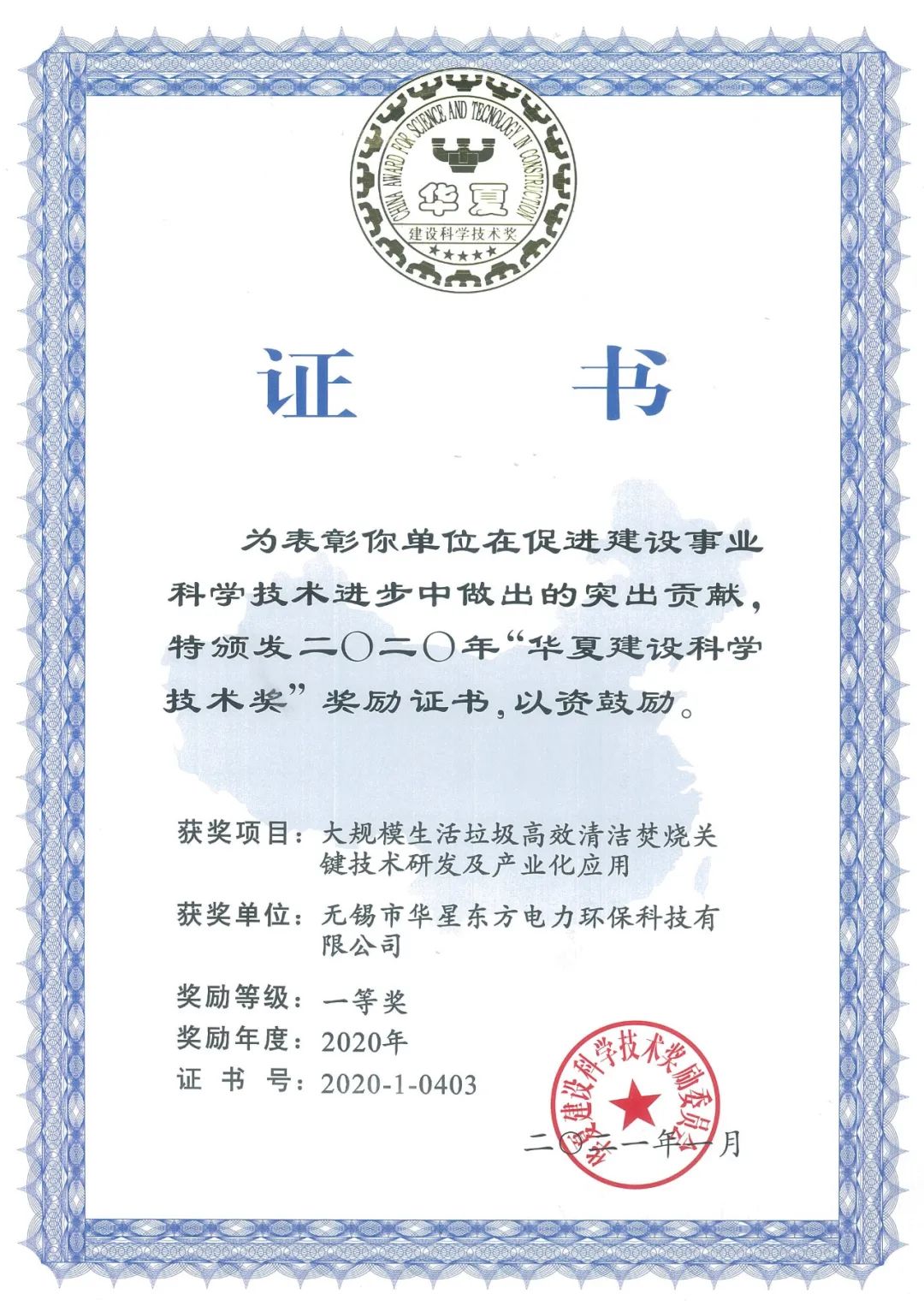 近日從華夏建設科學技術獎勵委員會傳來喜訊,華星東方于2020年7月參與申報的“大規模生活垃圾高效清潔焚燒關鍵技術及產業化應用”項目獲得一等獎。