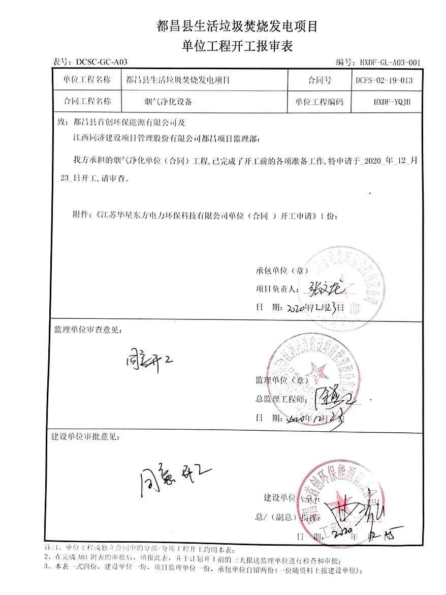我公司承建的江西省九江市都昌縣生活垃圾焚燒發(fā)電項目煙氣凈化工程于2020年12月25日開工建設(shè),現(xiàn)已進(jìn)入主體安裝環(huán)節(jié)。