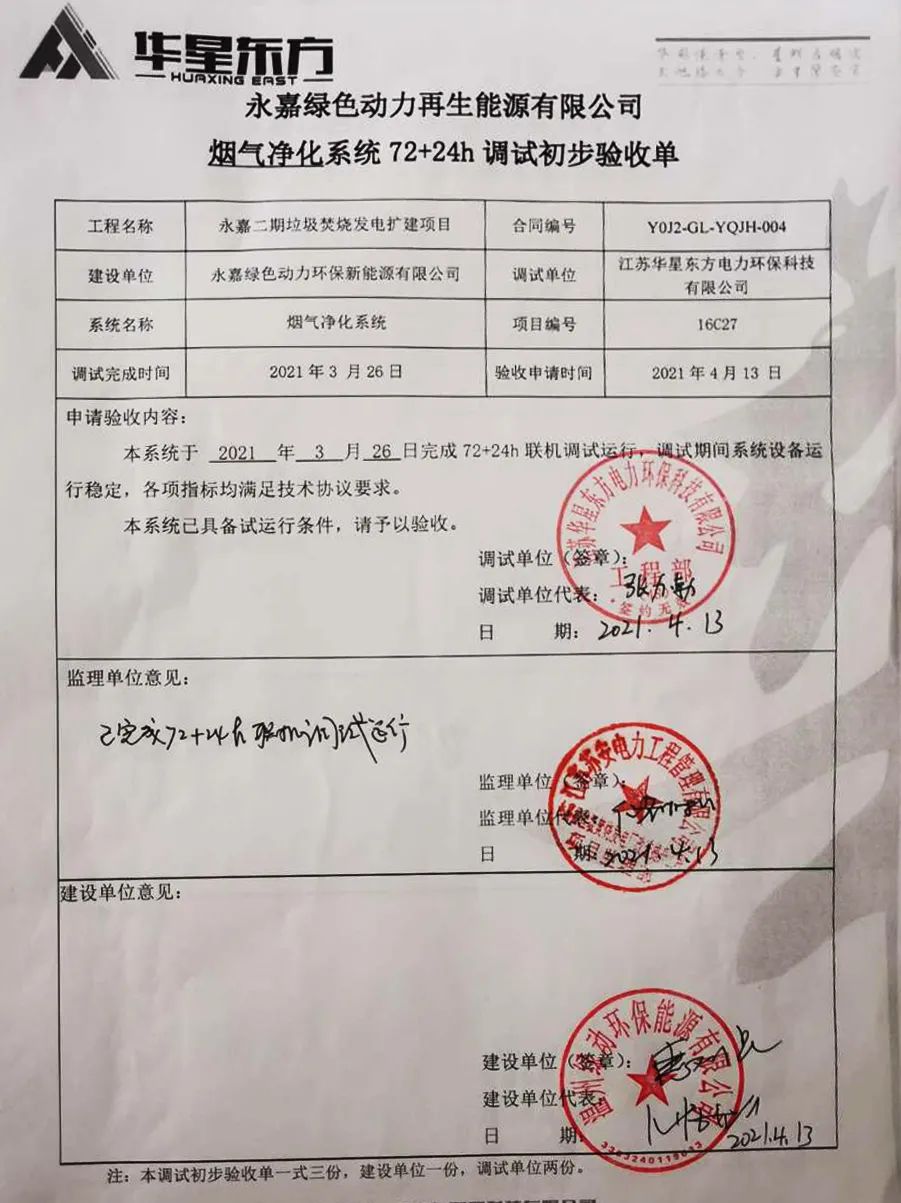 華星東方承建的浙江省溫州市永嘉二期垃圾焚燒發(fā)電擴(kuò)建項(xiàng)目煙氣凈化工程通過72+24小時(shí)試運(yùn)行