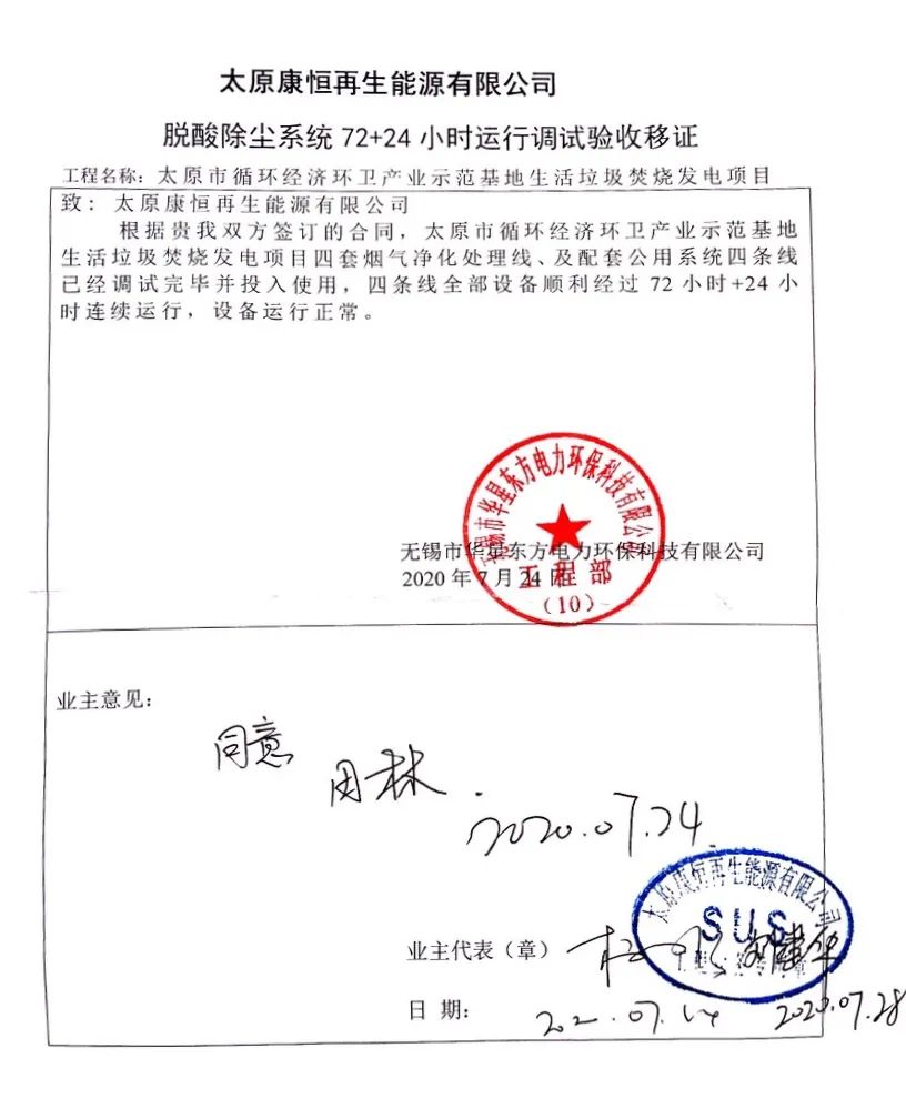 我公司承建的山西省太原市循環經濟環衛產業示范基地生活垃圾焚燒發電項目煙氣凈化工程于2020年7月28日通過72+24小時試運行。