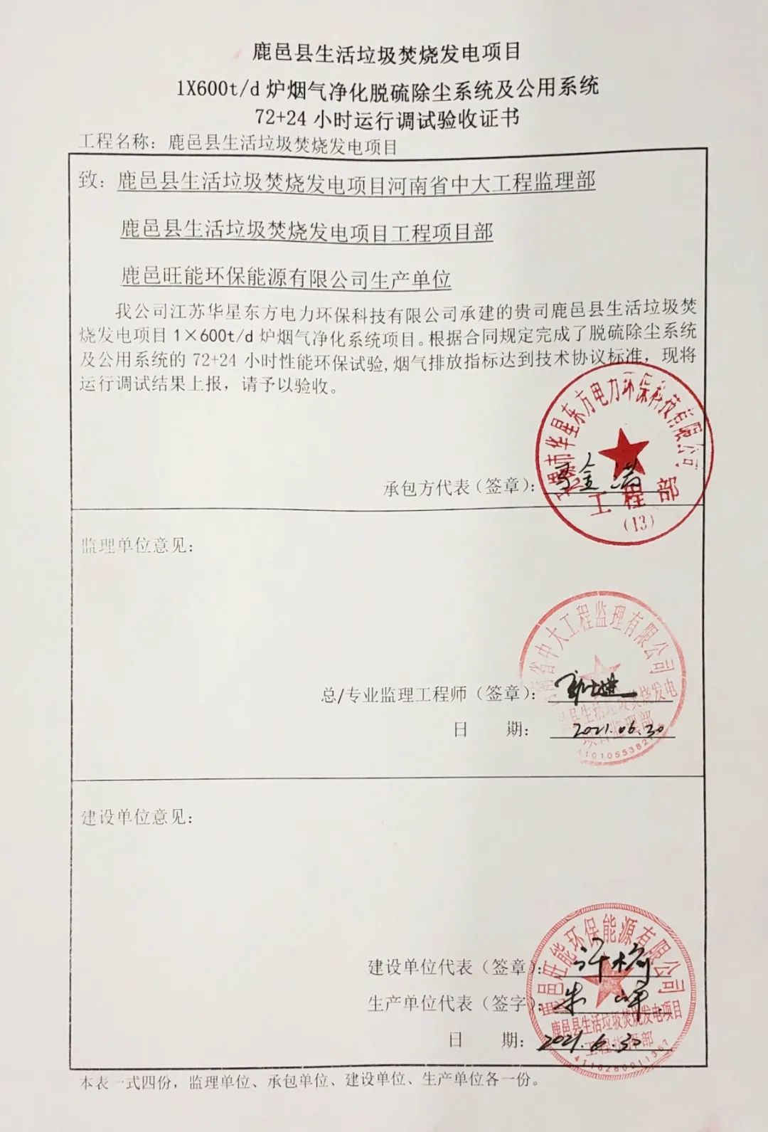 我公司承建的河南省周口市鹿邑縣生活垃圾焚燒發(fā)電項(xiàng)目煙氣凈化工程于2021年6月30日通過(guò)72+24小時(shí)試運(yùn)行。