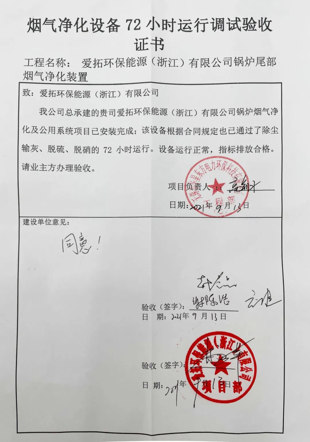 我公司承建的浙江省愛拓環保能源(浙江)有限公司鍋爐尾部煙氣凈化工程于2021年9月13日通過72+24小時試運行。