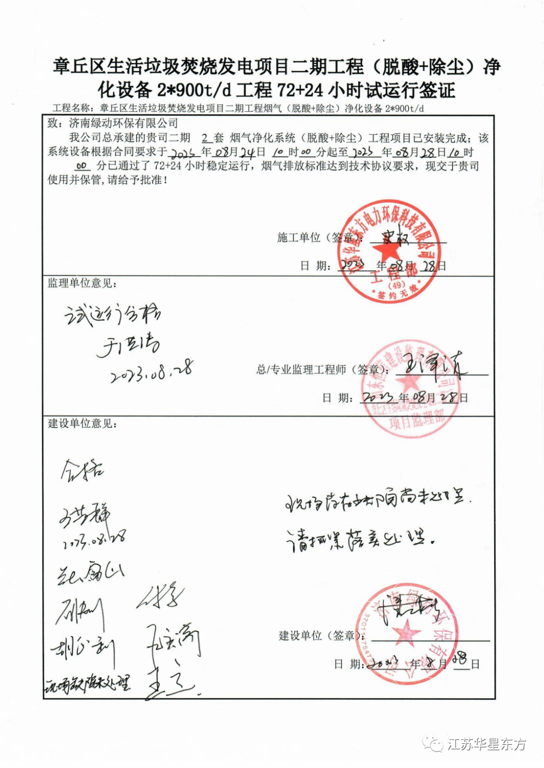 我公司承建的山東省濟南市章丘生活垃圾焚燒發電項目二期煙氣凈化工程于2023年08月28日通過72+24小時試運行。 The flue gas cleaning project of the second phase of Zhangqiu household waste incineration power generation project in Jinan city, Shandong province, which was constructed by our company, passed the 72+24 hours trial operation on August 28th, 2023.