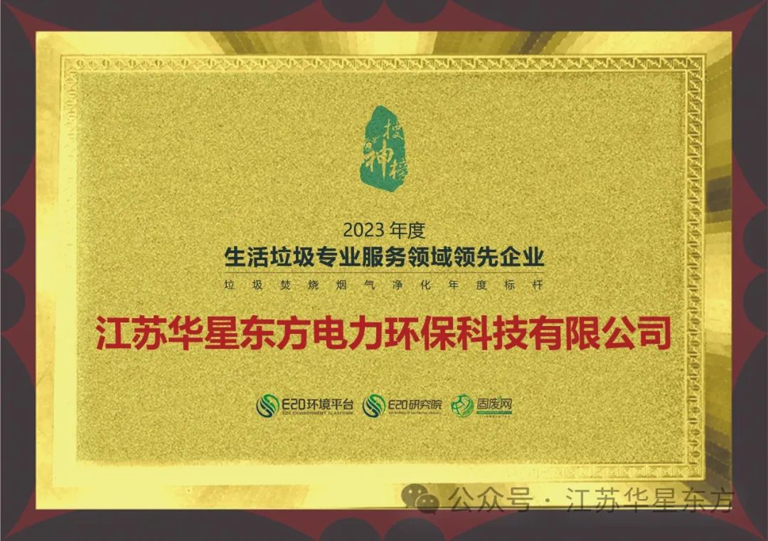 江蘇華星東方作為生活垃圾焚燒煙氣凈化領域領先的行業龍頭骨干企業,在E20環境平臺2023年度評選中連續第八年獲選“煙氣凈化年度標桿企業”。 As a leading industry leader in the field of domestic waste incineration flue gas cleaning, Jiangsu Huaxing East Co. was selected as the "Annual Benchmark Enterprise for Flue Gas Cleaning " for the eighth consecutive year in the 2023 annual selection of the E20 Environmental Platform.