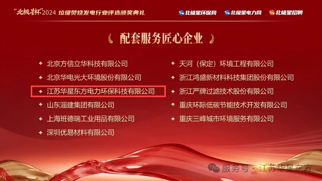 Jiangsu Huaxing East has been invited to participate in the "North Star Cup" 2024 annual waste incineration power generation industry selection ceremony in September 2024, . The selection lasted more than a month, after intense voting, expert review and comprehensive consideration of the selection committee. HEPT finally shortlisted in many enterprises. Since the award of the 2020 (first) waste incineration power generation industry selection activity, Jiangsu Huaxing East has been awarded the "Supporting service originality Enterprise" award for five consecutive times!