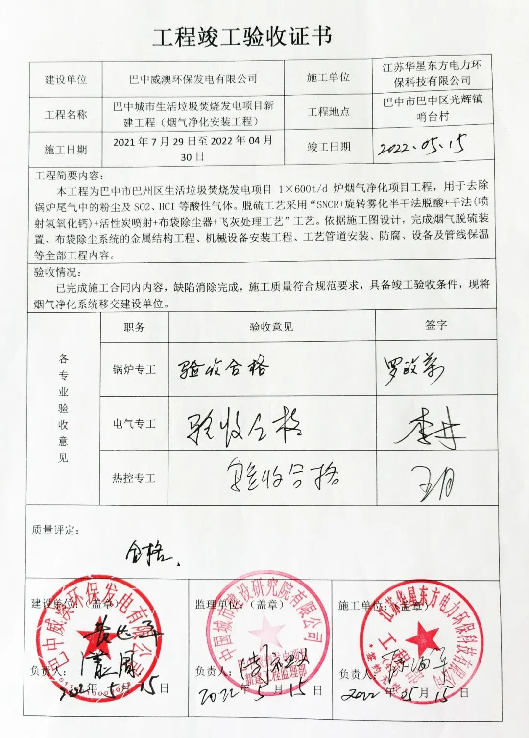 我公司承建的四川省巴中市垃圾焚燒發電項目二期煙氣凈化工程于2022年5月15日通過竣工驗收。