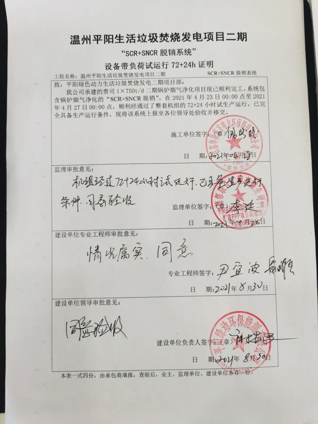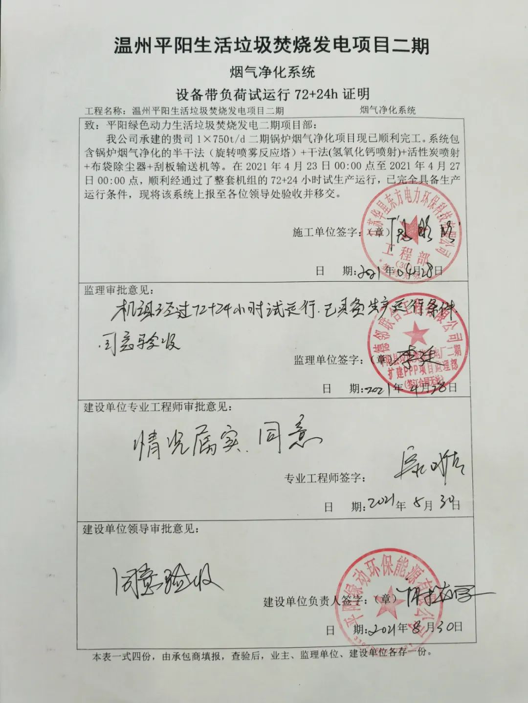 The FGC project undertaken by Huaxing for Pingyang Phase II WTE plant in Wenzhou, Zhejiang passed the 72 + 24 hours trial operation