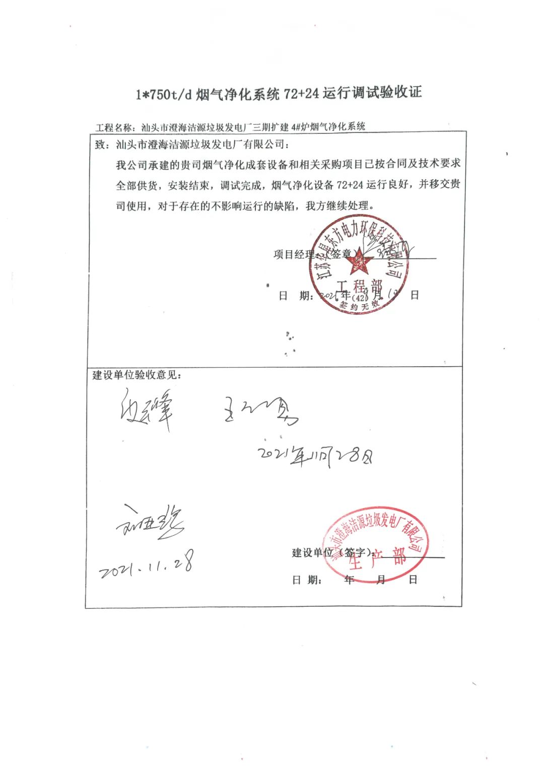 我公司承建的廣東省汕頭市澄海潔源生活垃圾焚燒發電項目三期煙氣凈化工程于2021年09月10日通過72+24小時試運行。