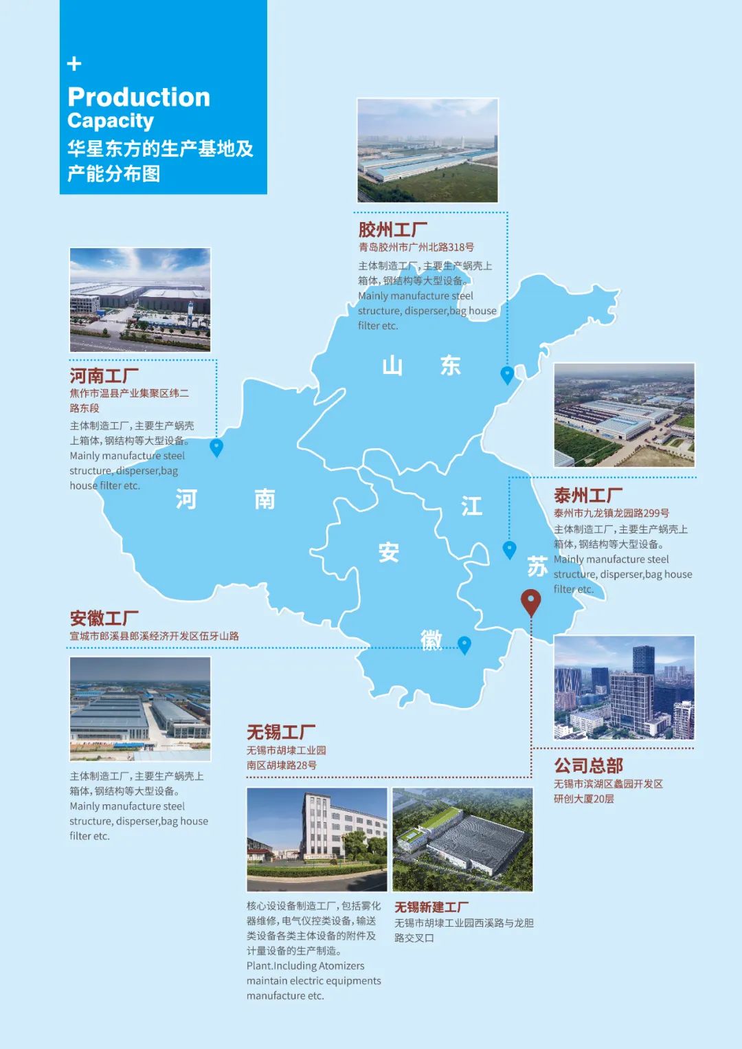 繼江蘇華星東方“安徽中易環保”平臺的設備和催化劑等生產裝備的投入,專注于不銹鋼,精密加工及電控產品為主的無錫二期工廠也將在9月陸續達產。江蘇華星東方自工程設計體系搬遷至無錫CBD區蠡園開發區,逐步構建起以蠡園開發區為工程設計研發、無錫為精密加工、宣城為催化劑新材料、焦作、青島、泰州為鋼結構制造的產能體系。合理化的產能結構分布,為成本控制及新一輪的縣域煙氣治理需求提供了最佳選擇方案和最優的成本控制布局。 Following Jiangsu Huaxing-east's investment in steel and catalyst fabrication machinary on the "Anhui Zhongyi EP" platform, the Wuxi Phase II factory, which focuses on stainless steel, precision machining, and electronic control products, will also gradually reach production in September, 2023. Huaxing-east relocated its engineering and design dept. to Liyuan Development Zone in CBD Wuxi, gradually building a production structure with Liyuan Development Zone as the design center, Wuxi factory as precision processing, Xuancheng factory as catalyst & new materials, and Jiaozuo / Qingdao / Taizhou as steel structure fabrication. The rational distribution of production capacity provides the best choice and optimal cost control layout for the new round of county level FGC demands.