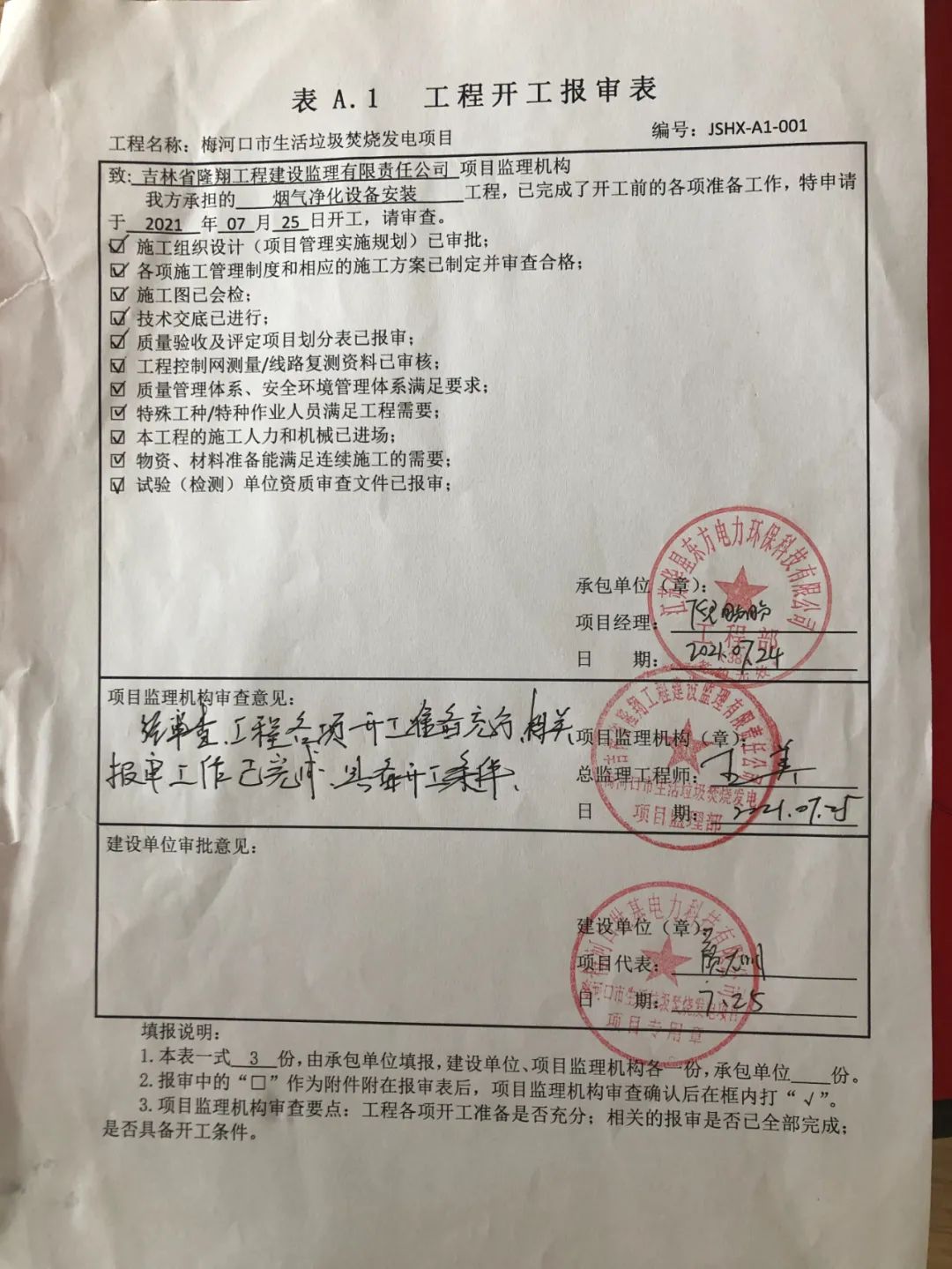 我公司承建的吉林省梅河口市生活垃圾焚燒發電項目煙氣凈化工程于2021年07月25日開工建設。